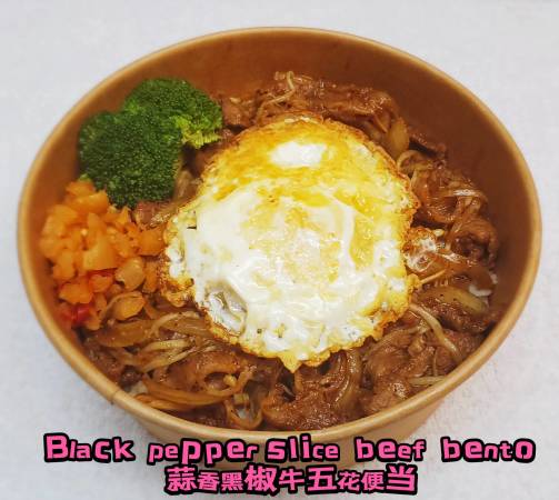 Black pepper slice beef with secret garlic sauce on rice 蒜香黑椒牛五花便当