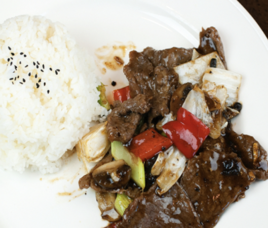 Savor tender beef cooked in rich black bean sauce laid on fluffy rice. This classic combination offers a deep umami flavor with a satisfying hearty texture.