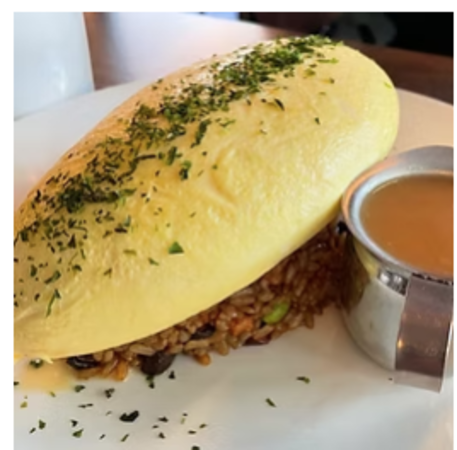 Soft omelette, chicken fried rice, shiitake, green peas, gravy